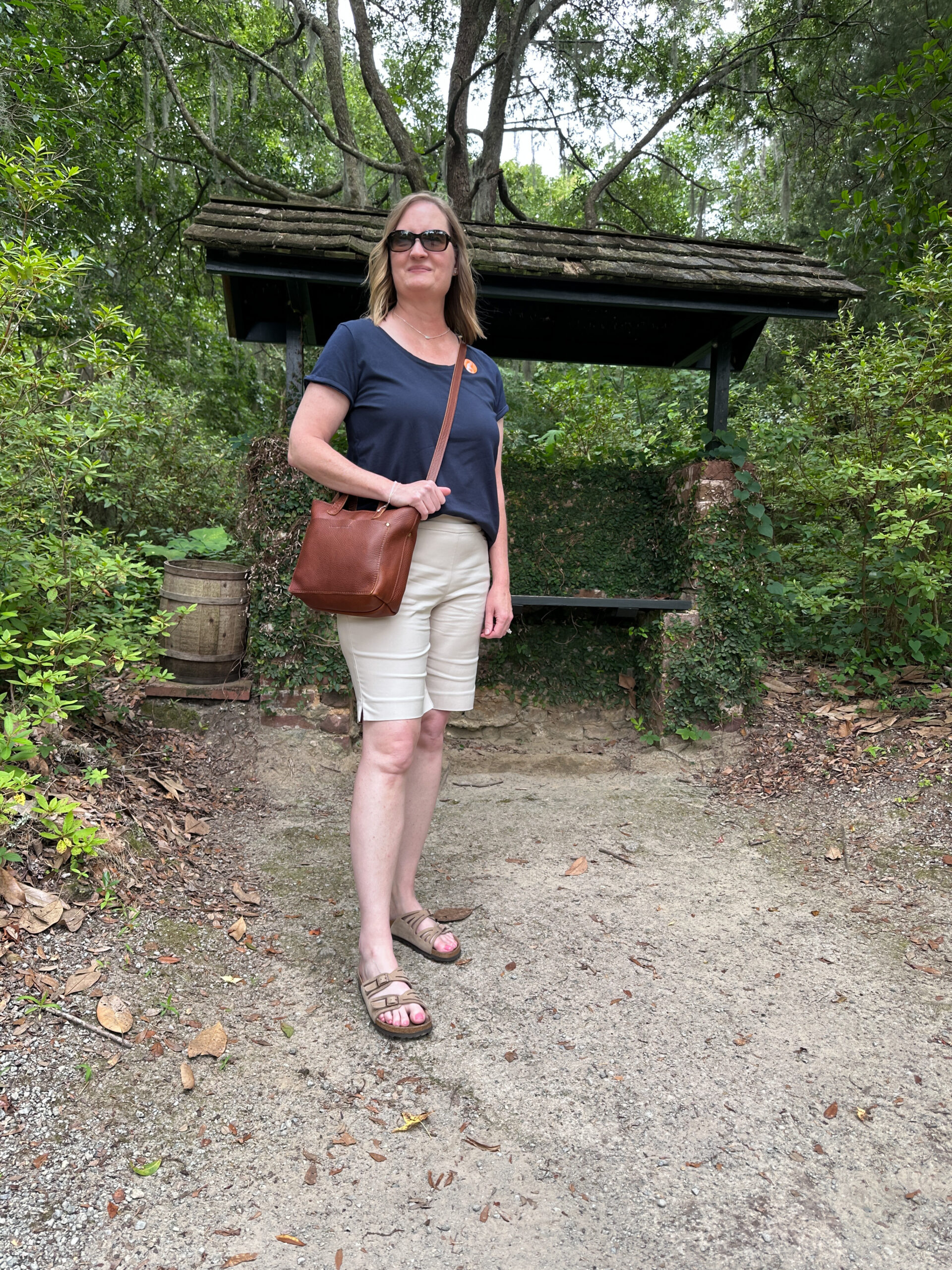 I wore my navy tee, beige bermuda shorts, Birkenstock Granada sandals and Portland Leather Mini Crossbody bag in “nutmeg”. It was cloudy that day, so I didn’t wear my hat. That evening we went to the Tanger Outlets and I bought a pair of sneakers to wear a couple of days on our trip!