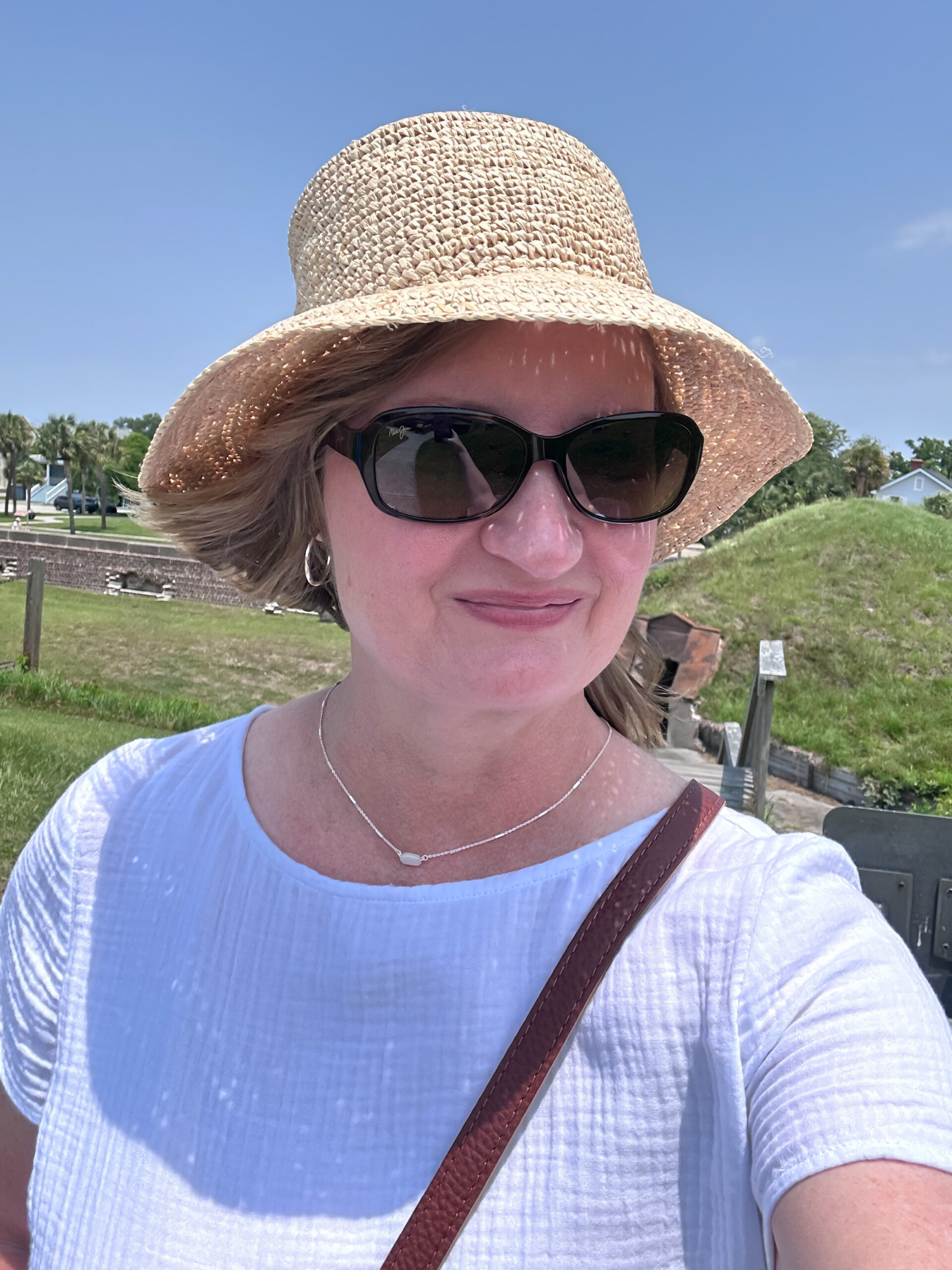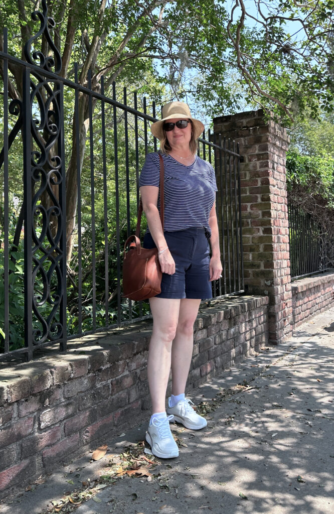 I wore my light blue tee, gray skort, Taos sandals, raffia bucket hat and Portland Leather Mini Crossbody bag in “nutmeg”. Even though my Taos sandals are walking sandals, they did not do well on the downtown Charleston sidewalks. All the sidewalks are uneven and are a mix of uneven concrete, old stone or old brick. Because I wore my soft sole sandals I developed a blister on the bottom of my foot. I highly recommend wearing either sneakers or hard sole sandals like Chacos or Birkenstocks.