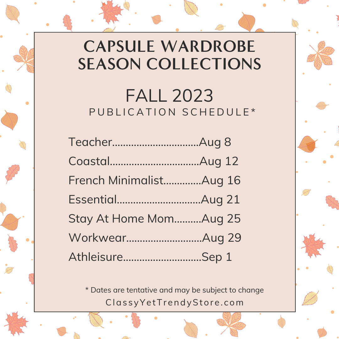 Here are the publication dates of the Fall 2023 Capsule Wardrobes in the Capsule Wardrobe Store:
