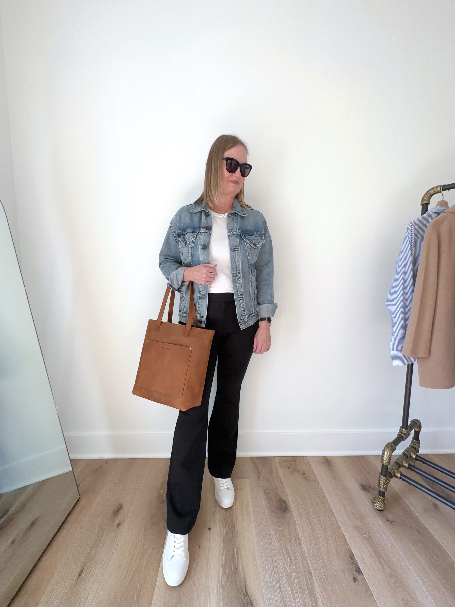 This High Waisted Pixie Flare Pants in “black” (size 12) outfit is casual with the Frye Ivy Low Lace Sneakers (sized up a half size to 9.5), Gap Factory White Crewneck Tee (size Large) and ABLE Merly Denim Jacket in “clean wash” (size Large). These Frye Ivy Low Lace Sneakers are new to my wardrobe and they are SO COMFY! I loved the Gap Factory White Crewneck Tee so much when it arrived in the mail that I ordered the black and gray colors as well! It is not see through with a nude color bra and the cut, fit, softness and style checks off ALL the boxes making it a perfect tee. I have had this ABLE Merly Denim Jacket in “clean wash” for a couple of years now and it’s my most favorite style of denim jacket. It is a blend of cotton and lyocell making it soft and not stiff at all, plus the length is a bit longer than most denim jackets, which flatters your figure. I also added this Portland Leather Crossbody Tote in the NEW “Dakota” color (c/o), which is a brushed leather and it is the perfect tote to carry to work, out shopping and bring with you to the ball football games since it can hold ALL THE THINGS!