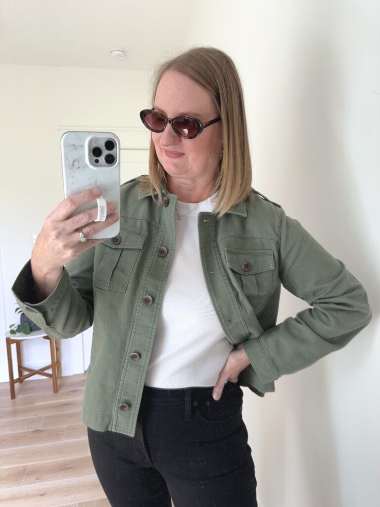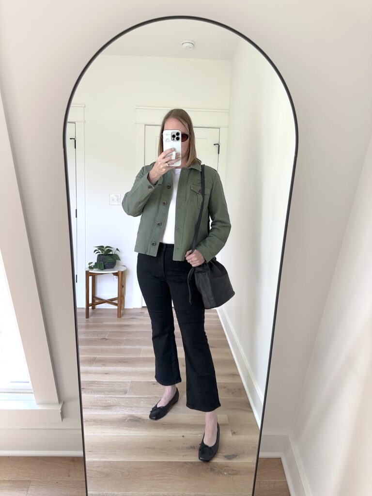 Madewell is having an awesome sale up to 30% off on these Kick Out Crop Jeans in “black rinse wash” (size 30 c/o), Brightside Ribbed Tee in “white” (size Large, c/o), the Piazza Bucket Bag in “true black” (c/o) and the Russell Oval Sunglasses in “afterglow red tort” (c/o). I’m wearing the Kick Out Crop Jeans in the Regular length with the measurements of 9 1/4″ rise, 16 1/4″ leg opening, 27 1/2″ inseam. They are a mix of 75% cotton (11% of which is recycled)/22% recycled polyester/3% elastane, so the fabric is stretchy but holds its shape. These jeans also come in Tall, Petite and Plus. This Brightside Ribbed Tee is a great tee to wear underneath all your cardigans and jackets this fall! It is a slim fit which lays smooth, which makes it perfect for layering. You may have seen this Piazza Bucket Bag in this post a few weeks back. It’s a great crossbody bag that is lightweight and roomy. I’m also wearing the Talbots Casual Jacket in “spring moss” (size Large) and is included in the Talbots: Buy One Get One 50% off Sale! My shoes aren’t on sale, but they are the M. Gemi Danza Flats in “black” (size 9) and are very comfortable!