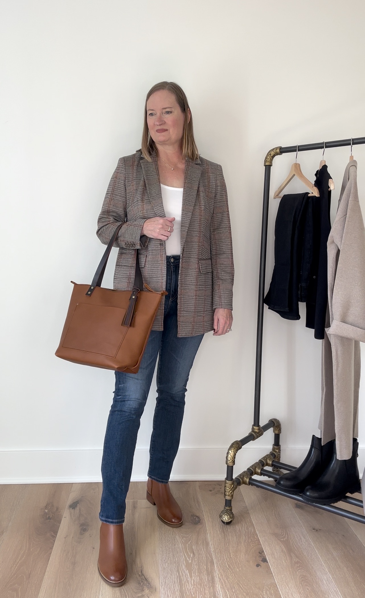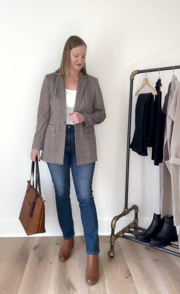 There are SO MANY ways to style these Hampshire Buckle Leather Booties (sized up to a 9.5 to wear with socks), where do I even begin? They are a classic style boot with a rich, tan color that goes with so many outfits! I styled them by wearing this Amazon Aware White Tank (Amazon’s own Climate-Friendly made brand) (size Large), my blazer is from Loft last year / similar plaid blazer HERE and HERE and AG Mari Slim Straight Jeans (size 31) / similar. My bag is the Portland Leather Medium Zipper Tote in “Honey” with the added coordinating Tassel in “Cognac”. The jewelry I’m wearing are my new Pavoi Gold Hoop Earrings and my Pavoi Bezel Gold Necklace I’ve had for a couple of years.