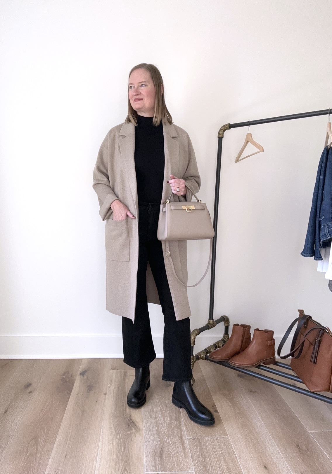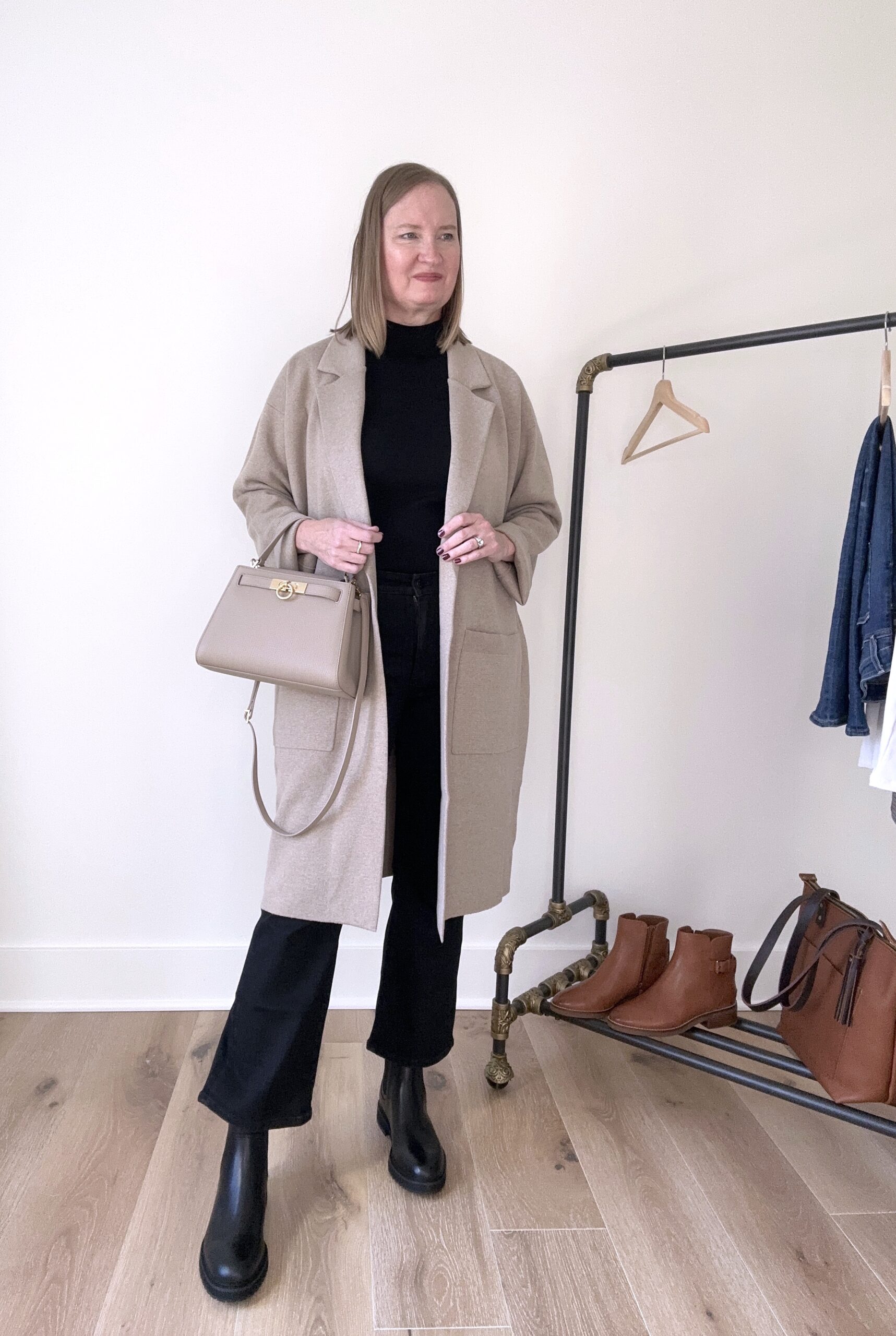I love the lug sole on these Greenwich Booties (sized up a half size to 9.5 to wear with socks)! The sole is a bit more thick than regular boots, but not overly chunky like many log soles out there. In my opinion, they are the perfect lug sole boot and I can’t wait to wear them all winter to keep my feet toasty warm! If you live in an area that has a lot of snow during the winter, these will be perfect for you, since they are waterproof. I styled these boots with my new J. Crew Ella Long Sweater Blazer in “Hthr Birch” (runs large, I sized down to a Medium), Ann Taylor Mock Neck Sweater Shell in “black” (size Large; also have this in the “winter white” and cafe au lait” colors), Madewell Kick Out Crop Jeans in “black rinse wash” (size 30) and Parisa Wang Madison Medium Top Handle Bag in “Taupe”. The jewelry I’m wearing are my new Pavoi Gold Hoop Earrings and my Pavoi Bezel Gold Necklace I’ve had for a couple of years.