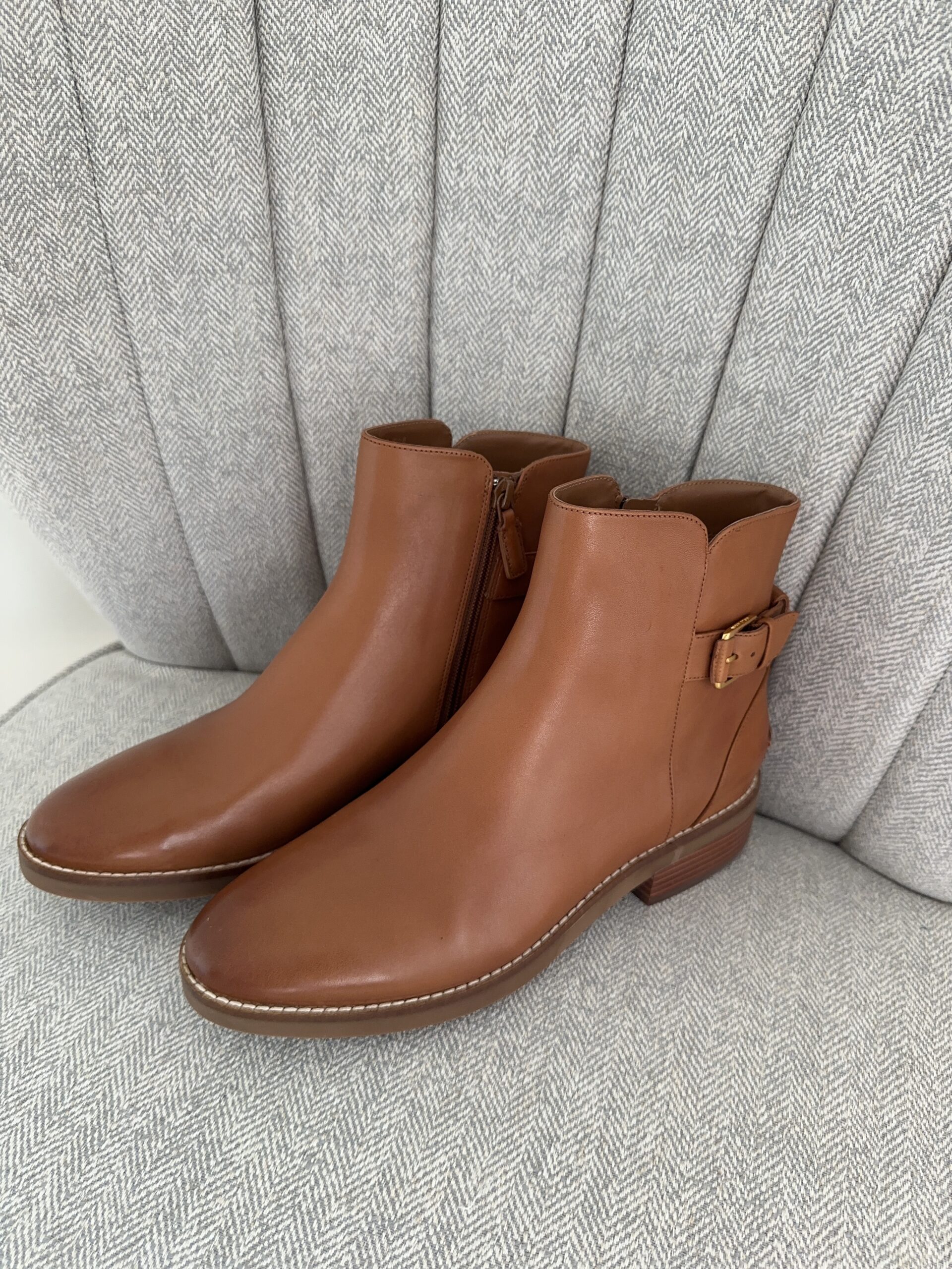 One of my most favorite neutral colors to wear in shoes is tan since it is a rich, earthy color. I was excited to see these Hampshire Buckle Leather Booties in “British Tan” and I knew that I needed these boots for my wardrobe! These boots are beautiful online in the photos, but they are even more beautiful in person! I don’t think I have ever worn a pair of boots this comfortable before. You can choose the British Tan color or two other colors, Black or Dark Latte Suede. The Hampshire Buckle Leather Booties are a classic style boot that will go with all your outfits. They have a low heel that is so easy to walk in, have a soft fabric lining and a rubber sole that is quiet and comfortable. You will see me wearing these boots on repeat this fall and winter!