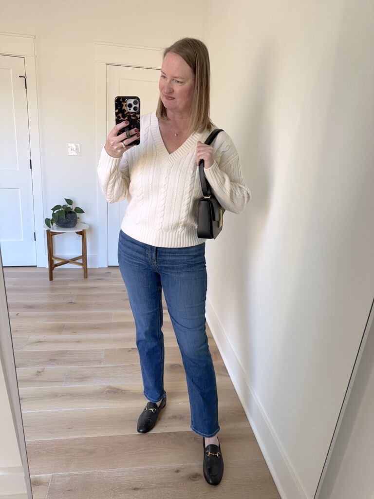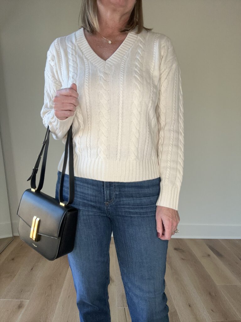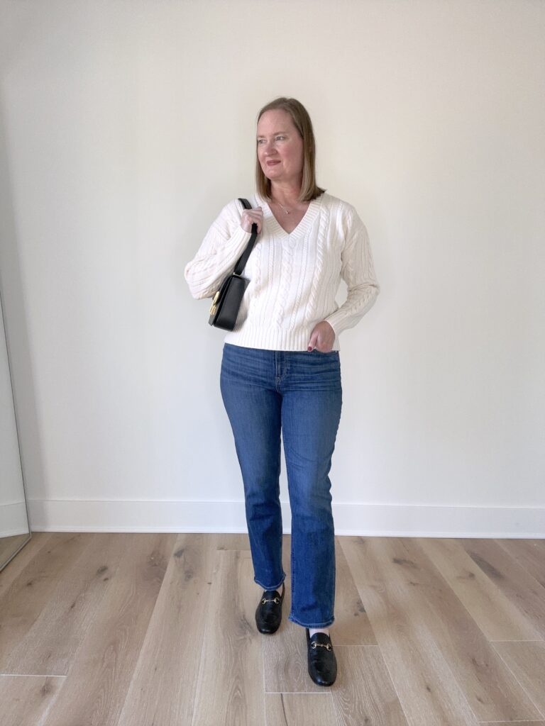 I LOVE the style of this Cable-Knit Wool-Cashmere Blend Sweater in “white”! I’m wearing a size Large. The v-neck style gives this sweater a feminine look and a relaxed vibe. This everyday cashmere cable sweater is a classic and timeless design that you can wear for years to come! I’m wearing it with high rise straight leg jeans and loafers, which you can wear to the office, just add a blazer to elevate the look and wear with a coat for those chilly days. You an also add a button down shirt layered underneath the sweater for extra warmth.