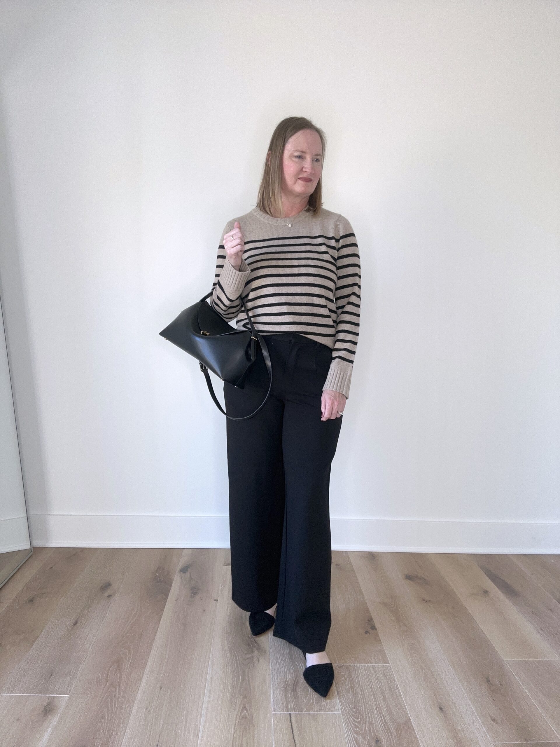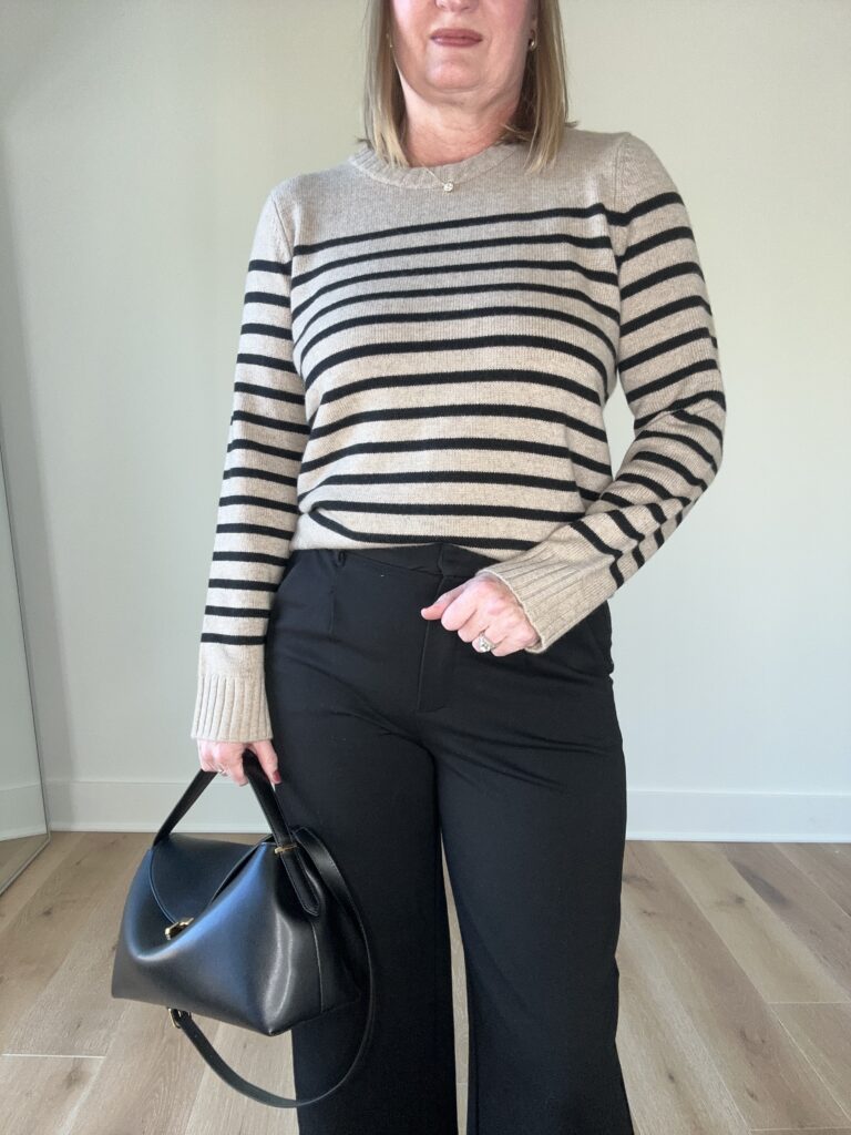 My favorite pattern is stripes, so when I saw this Striped Round Collar Cashmere Sweater in “Camel With Black Stripes”, I knew I had to have it! The cashmere is OH SO SOFT and the fit is perfect! I’m wearing a Large in this sweater and it fits true to size. I love the color tone of this sweater as it is a gorgeous neutral color that can be worn many ways. I dressed it up by wearing black wide leg pants and black flats. You can also wear it with jeans, a midi skirt or casually with black leggings or joggers.