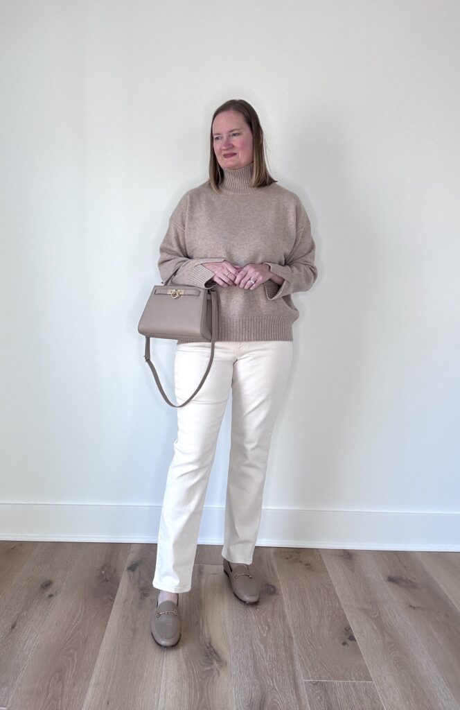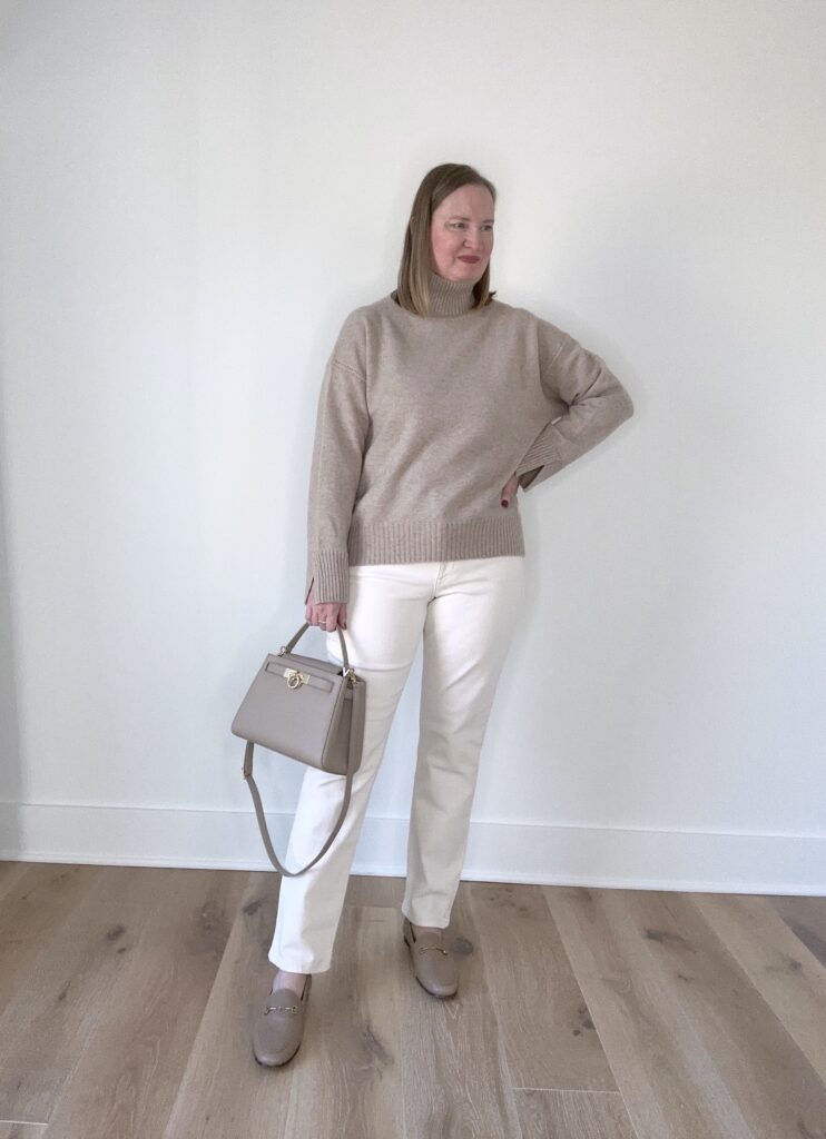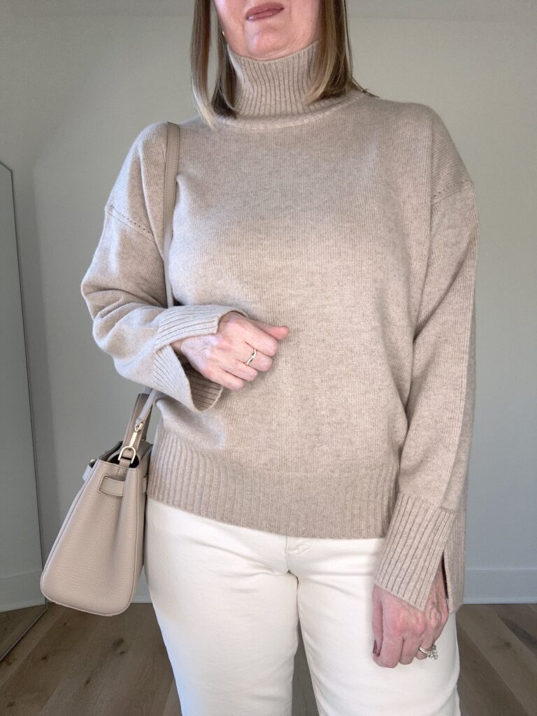 This Turtleneck Relaxed-Fit Cashmere Sweater in “Beige” is so classy and chic (wearing a Large)! This sweater has a high neck design (you an easily fold it under for a shorter neck), a relaxed fit and a split sleeve design. I’m wearing it Smart-Casual style with ecru jeans and loafers. You can also wear it with dress pants, jeans or a midi slip skirt.