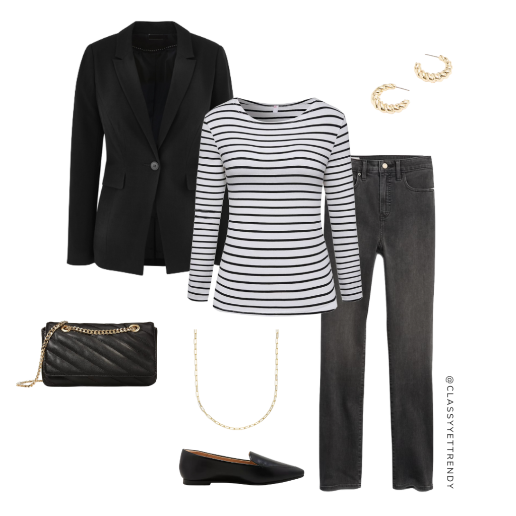 These 10 French style basics will make 9 outfits! You may already have these pieces in your closet. If you are missing any, use the convenient shopping links below to add them to your closet!