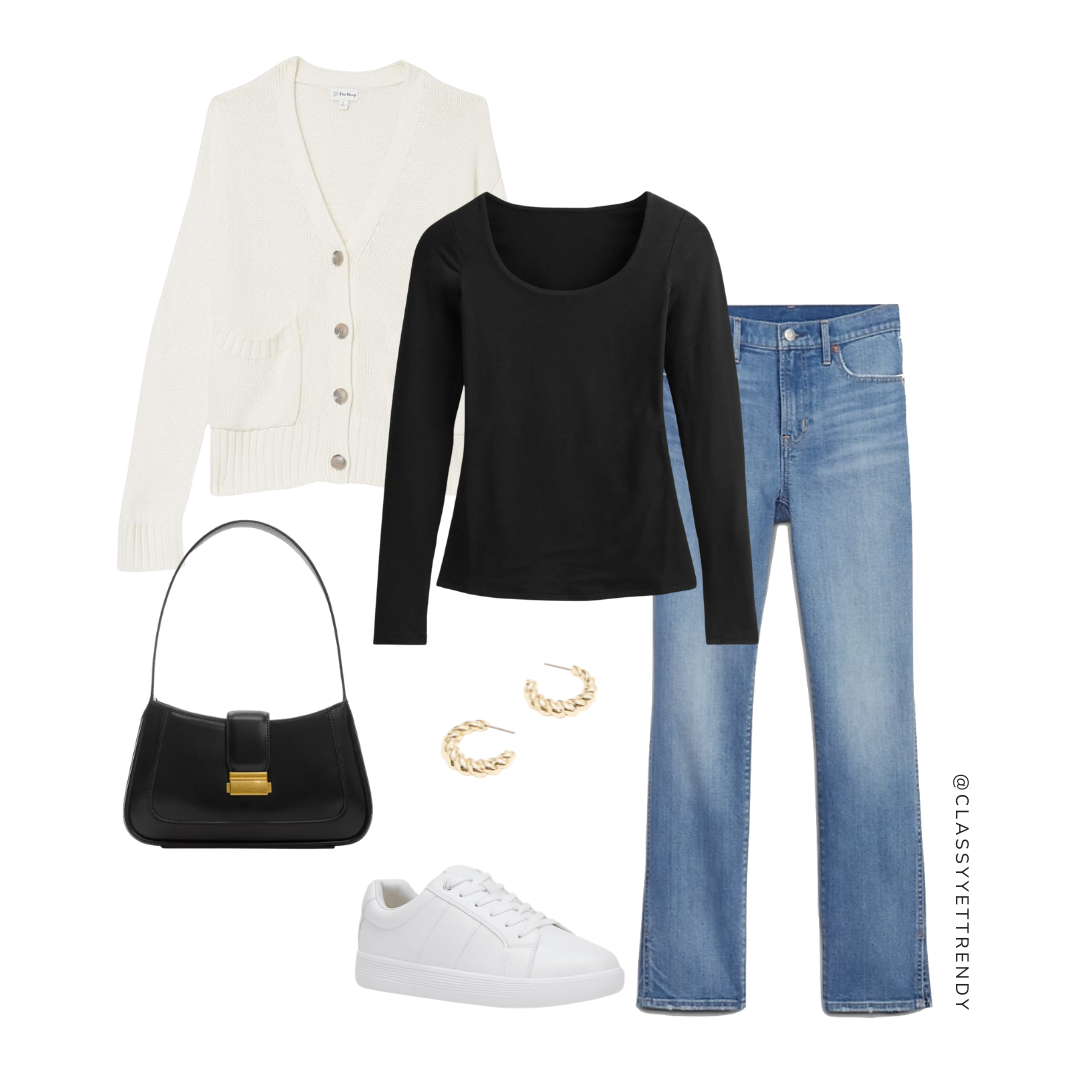 You can expand this mini capsule wardrobe by adding more pieces! You could add pieces like a white shirt, ivory blouse, black pants, gray pants, black midi skirt, beige loafers or black boots. You can also add your favorite accent color pieces from your closet like a blush color top, green pants, blue cardigan or brown loafers.
