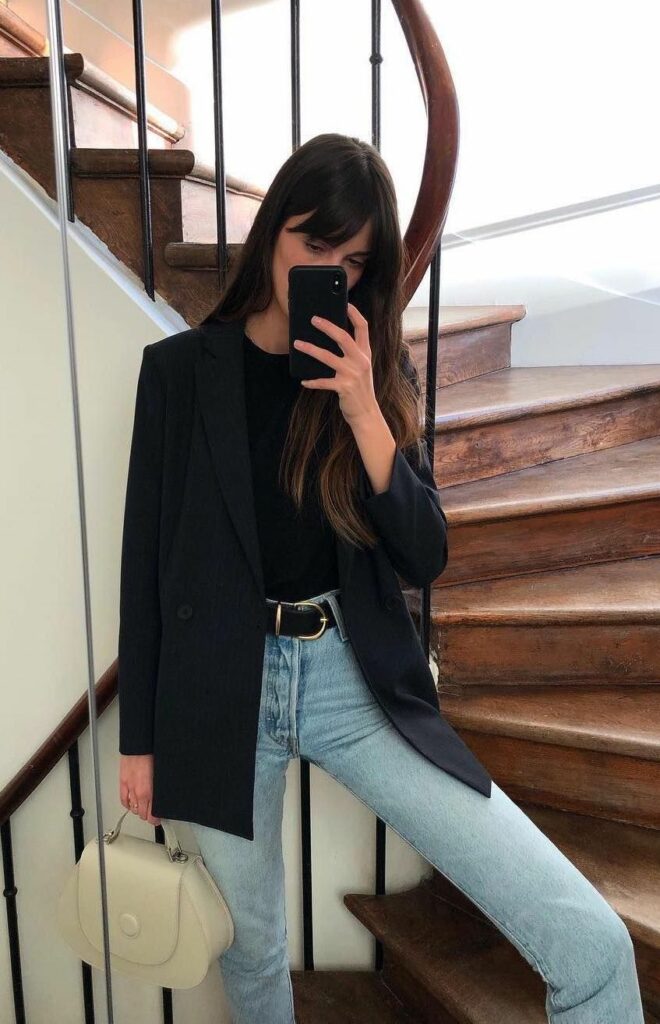 French minimalist style is simply classic and timeless styles in mostly solid, neutral colors. Such pieces are a white tee, striped tee, straight leg jeans with no distressing, ballet flats, casual sneakers, a black blazer and trench coat.