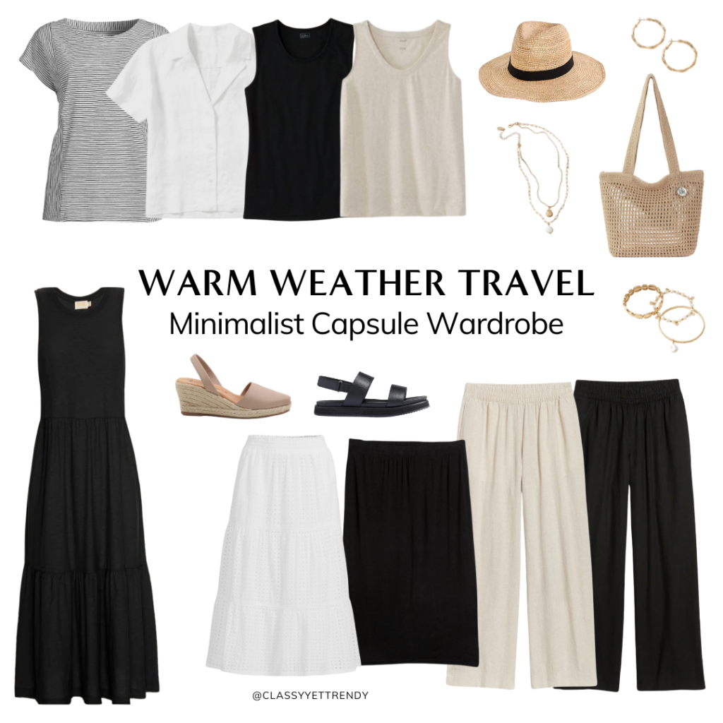 I created a Minimalist Travel Spring Capsule Wardrobe | 10 Pieces, 9 Outfits and shared it on the blog and on Instagram earlier this week. Several of you contacted me wanted a travel capsule to wear to warm weather destinations, like Florida, coastal cities, the Bahamas and Virgin Islands. I heard you and I have created a capsule wardrobe for those types of vacations! This capsule wardrobe has 11 pieces (tops, bottoms, a dress and shoes) and I made 10 outfits and you can probably make more outfits! All the pieces are neutral colors, so you can mix and match them to create many outfits.