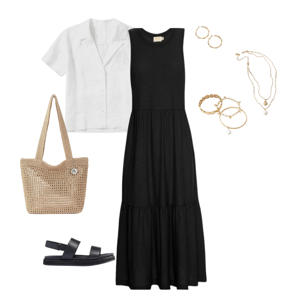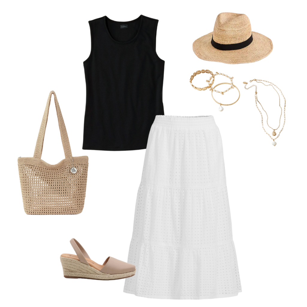 You can sub the Black pieces for Navy ones! For those of you with cool undertones, navy may look better with your complexion. For the pieces that are black in this capsule, use navy ones instead: black striped tee for this navy striped tee, black tank for this navy tank in “raven blue”, black dress for this navy dress, black pants for these navy linen pants, black skirt for this navy skirt, the black sandals with these Bone color sandals. You can also sub the black ribbon straw hat with this straw hat in “mix beige-beige” color.