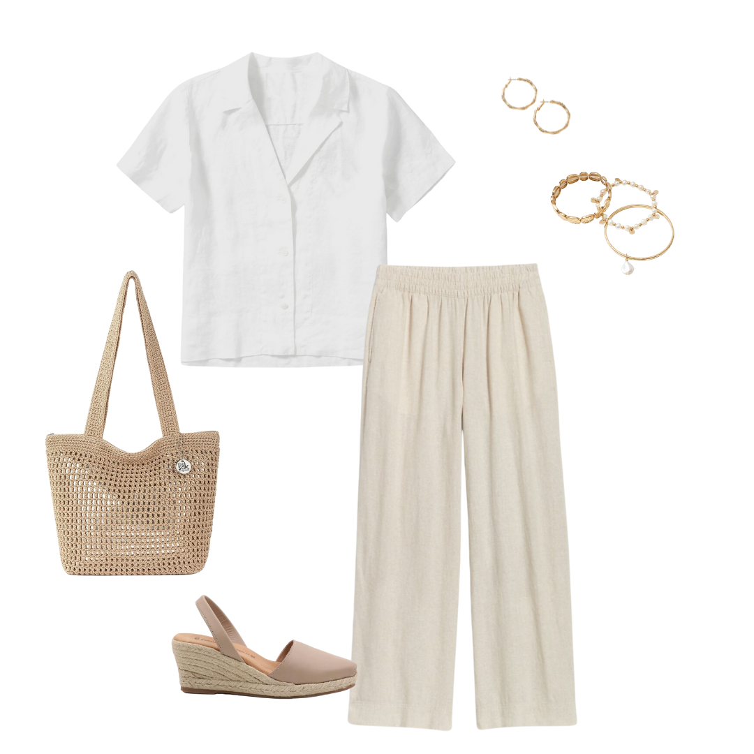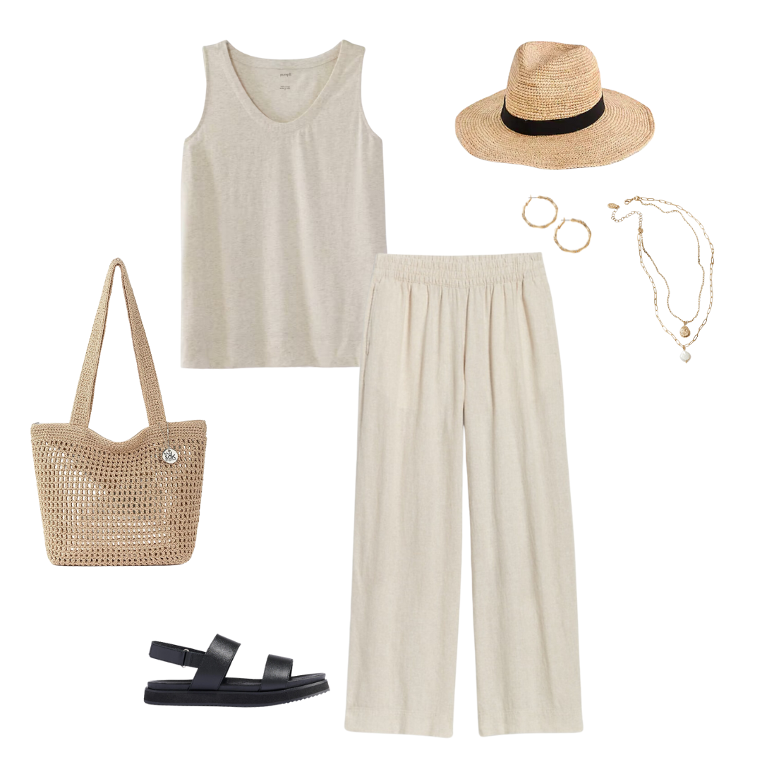 When you are planning what clothes and shoes to pack, look to your destination first, then find out what the weather will be at your destination. This capsule wardrobe would be great to wear if you are going to a warm weather destination like Florida, coastal cities, Bahamas or the Virgin Islands. Several of the clothes I chose for this capsule wardrobe will keep you cool in the warm temps, like linen, cotton or rayon; the flowy skirts are soft to the touch and easy to wear. I included a simple, sleeveless dress (which you can also wear to the beach over your swimsuit), light tops and tanks, linen pants, skirts and two pairs of comfy shoes for sightseeing and walking.