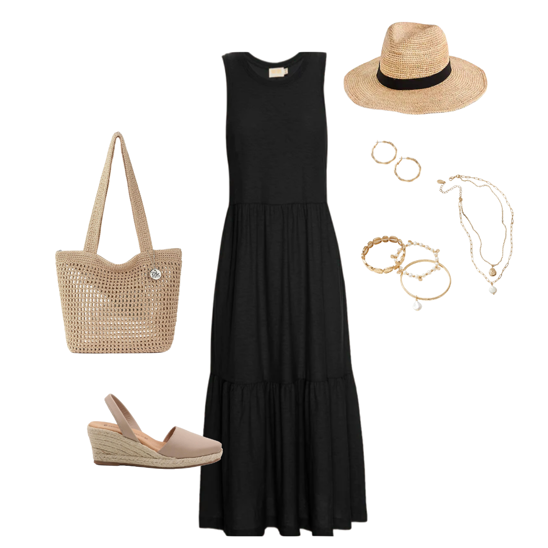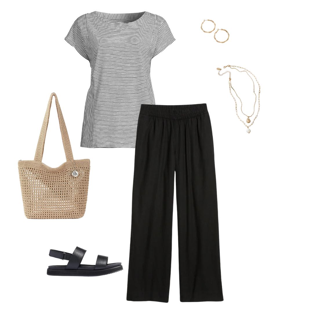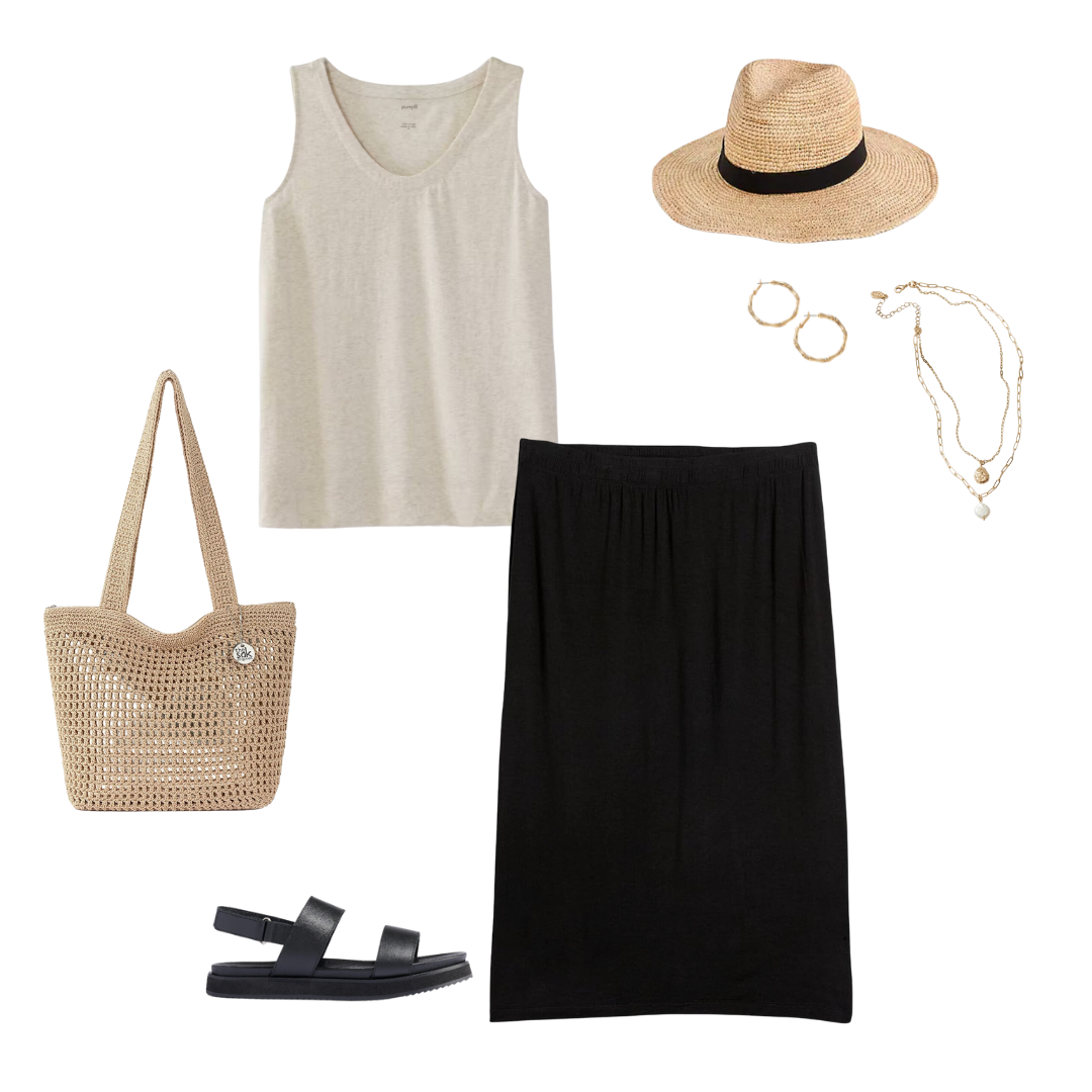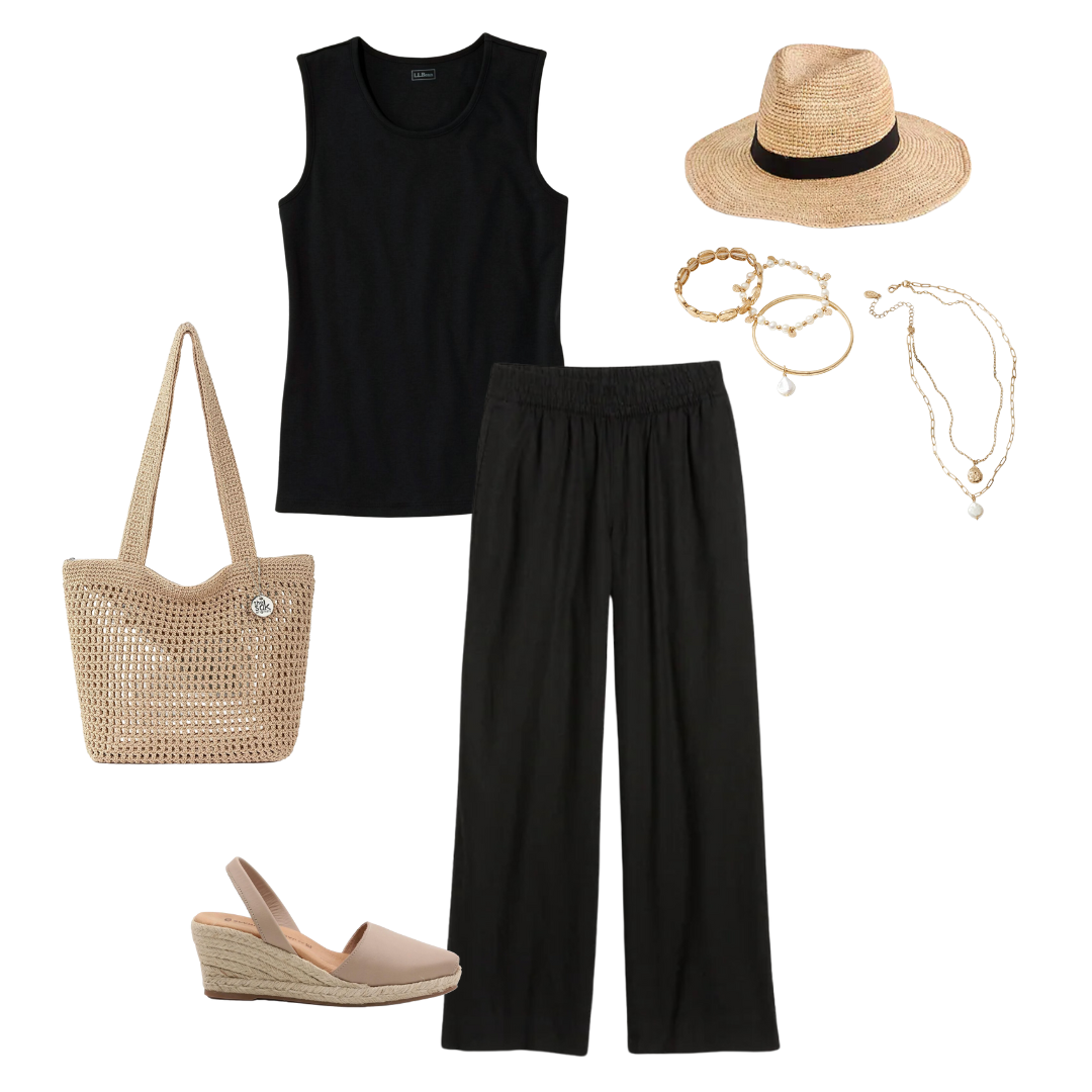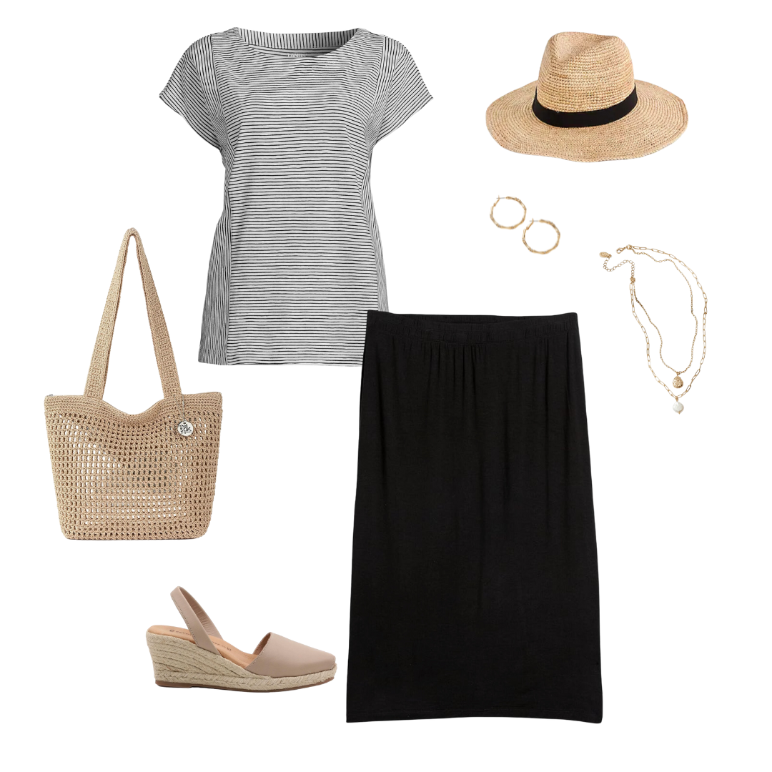 You can sub the Black pieces for Navy ones! For those of you with cool undertones, navy may look better with your complexion. For the pieces that are black in this capsule, use navy ones instead: black striped tee for this navy striped tee, black tank for this navy tank in “raven blue”, black dress for this navy dress, black pants for these navy linen pants, black skirt for this navy skirt, the black sandals with these Bone color sandals. You can also sub the black ribbon straw hat with this straw hat in “mix beige-beige” color.