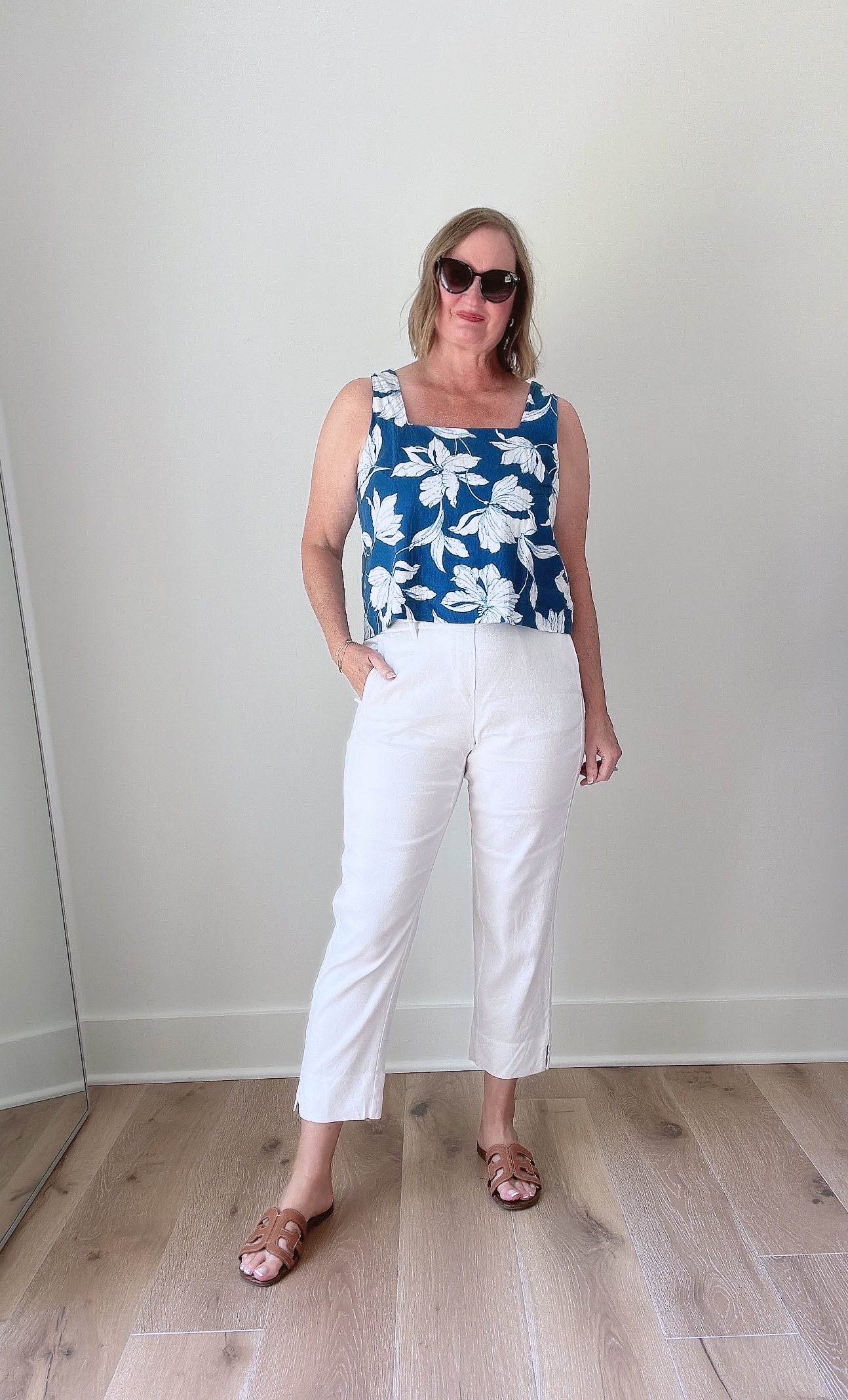 Here are three ways I styled the Gap Cropped Linen-Blend Tank in “Blue & White Floral”(size Large Tall):