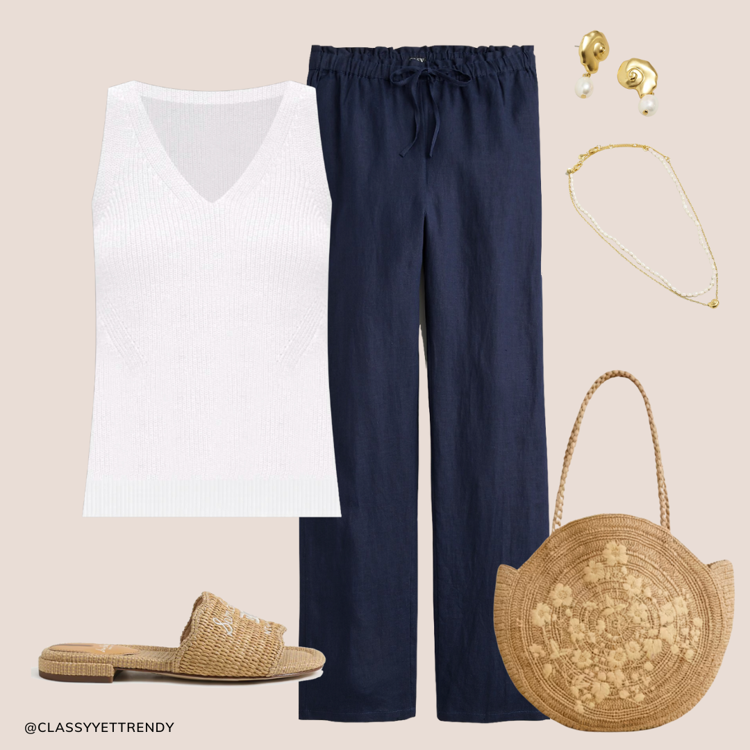 Here are 7 outfit ideas with a crochet sweater tank top (see all the options I linked above). Everything in the outfits are included in The French Riviera Capsule Wardrobe: Summer 2024 Collection. The French Riviera capsule wardrobe includes two convenient shopping links for each pieces in the capsule at different price points.