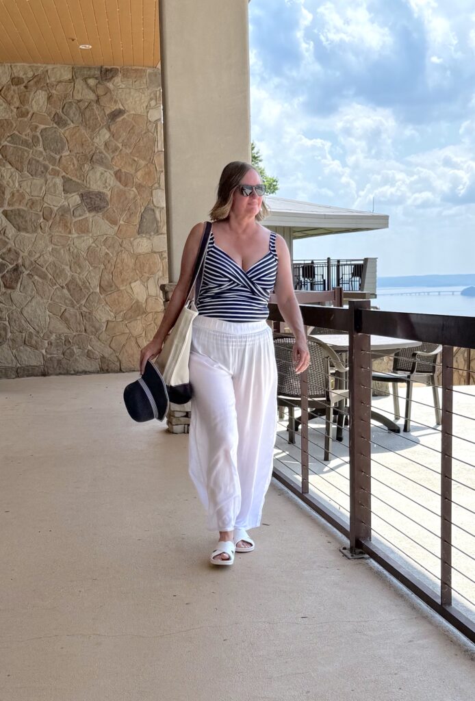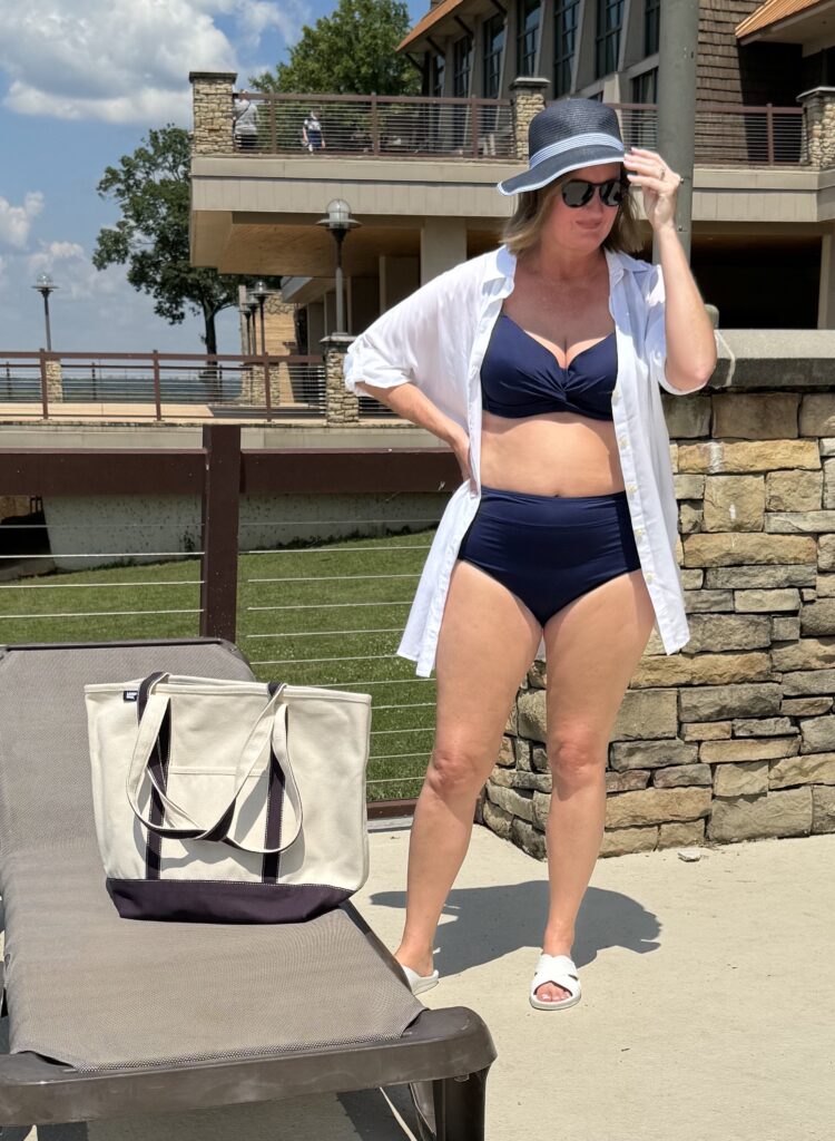 I paired the Chlorine Resistant Wrap Underwire Tankini Swimsuit Top in “Deep Sea/White Media Stripe” (size 12, Regular, Underwire) with the Chlorine Resistant Tummy Control High Waisted Bikini Swim Bottoms in “Deep Sea Navy” (size 12). This time I wore the Sheer Oversized Swim Cover-up Pant in “White” (size M 10-12) over the swimsuit bottoms to the pool. I also wore the Facesaver Sun Hat in “Radiant Navy” (size SM) and carried the Large size 5 Pocket Open Top Canvas Tote Bag in “Natural/Radiant Navy”.