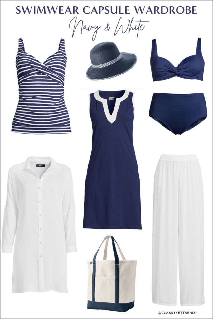 I created a swimwear capsule wardrobe so that I can mix and match pieces when I go to the beach and pool. It was easy to pull a few pieces together that are summer essentials, including swimwear, cover-ups, a hat and a tote to carry everything in.