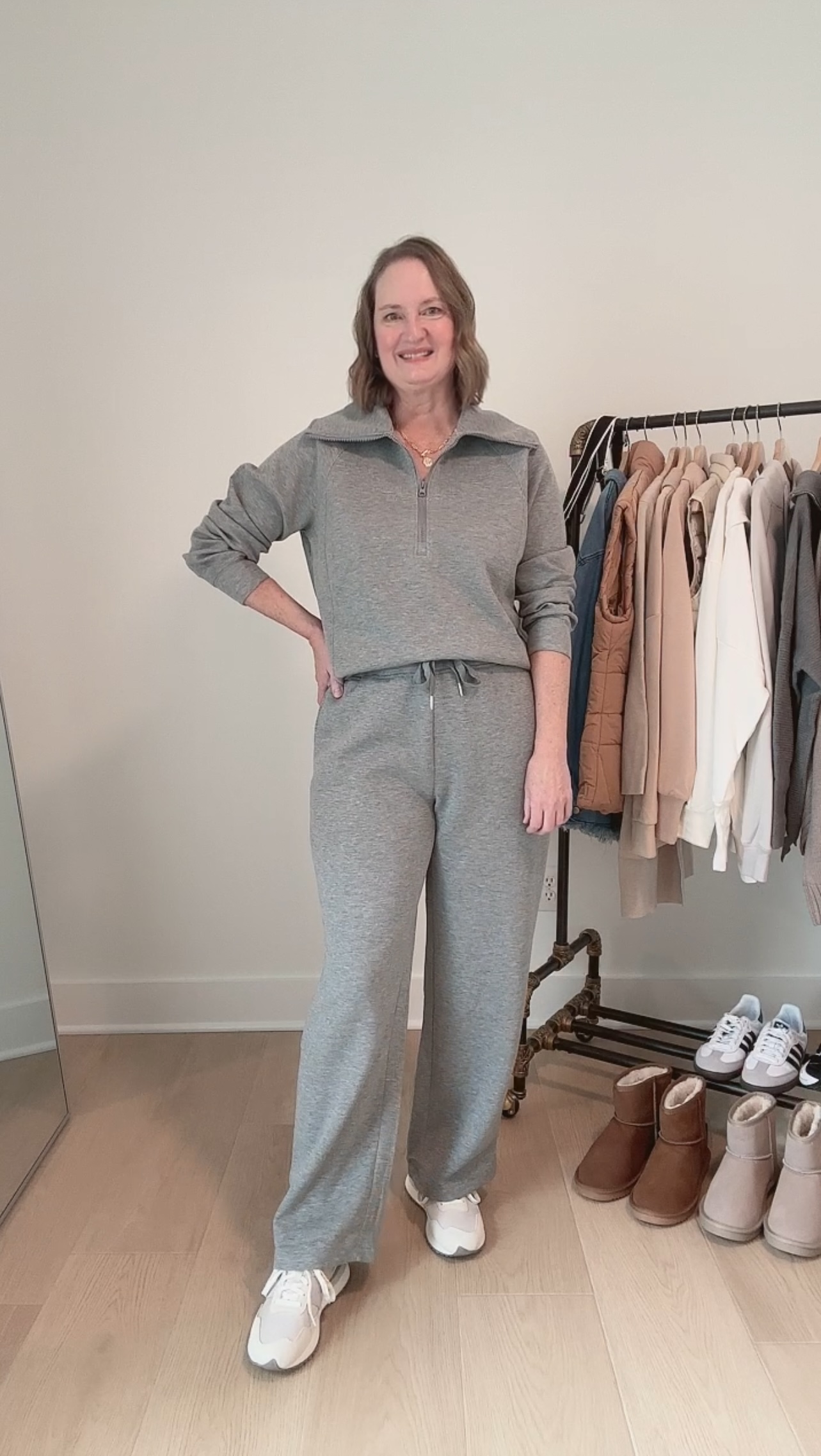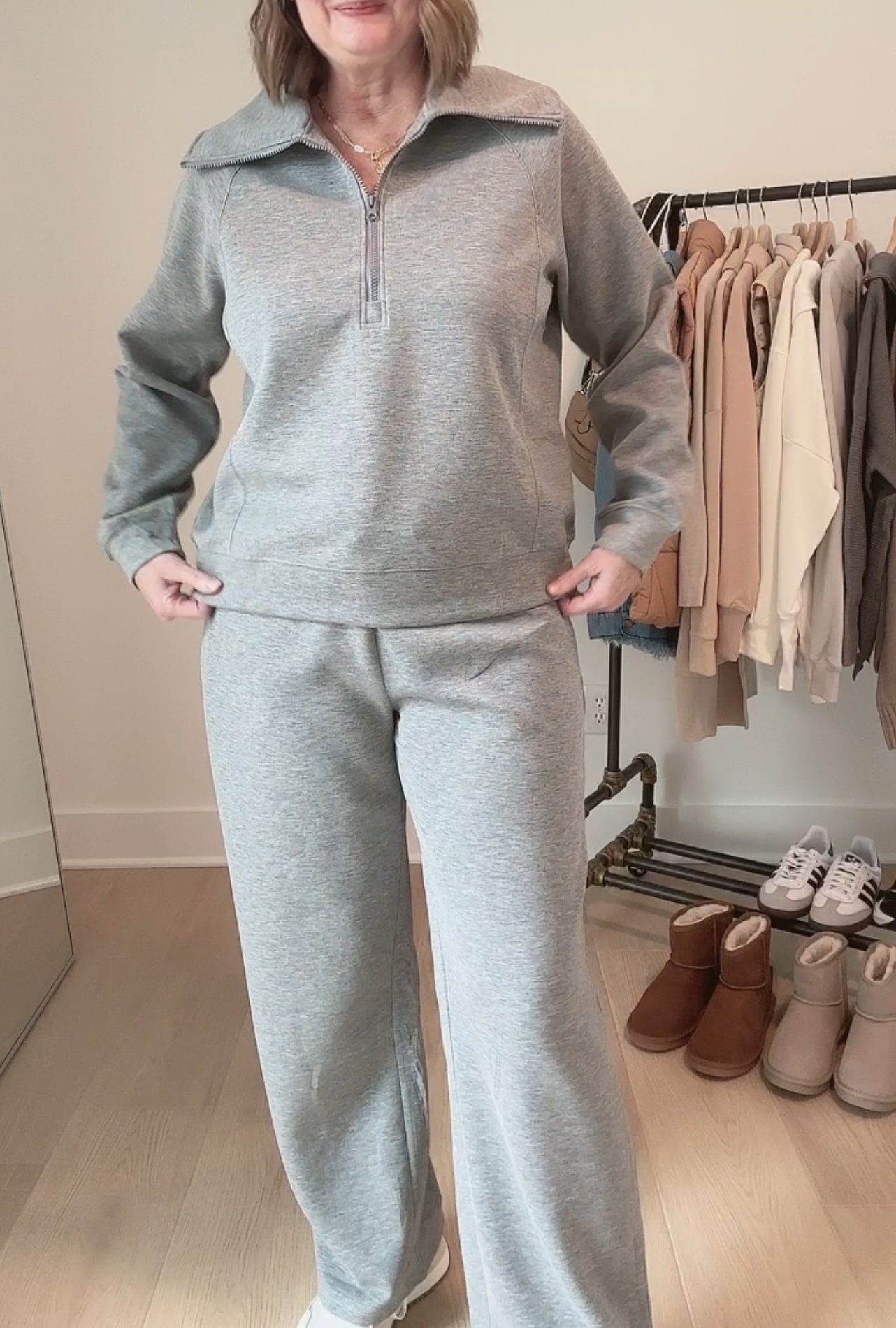 This 2-piece set includes a half zip sweatshirt top and wide leg drawstring pants. The pieces look great together and you can mix and match them with other pieces in your closet for more outfits! This set will be perfect in your capsule wardrobe. You can wear it now and throughout the winter season. I’m wearing a size Large in both sets.