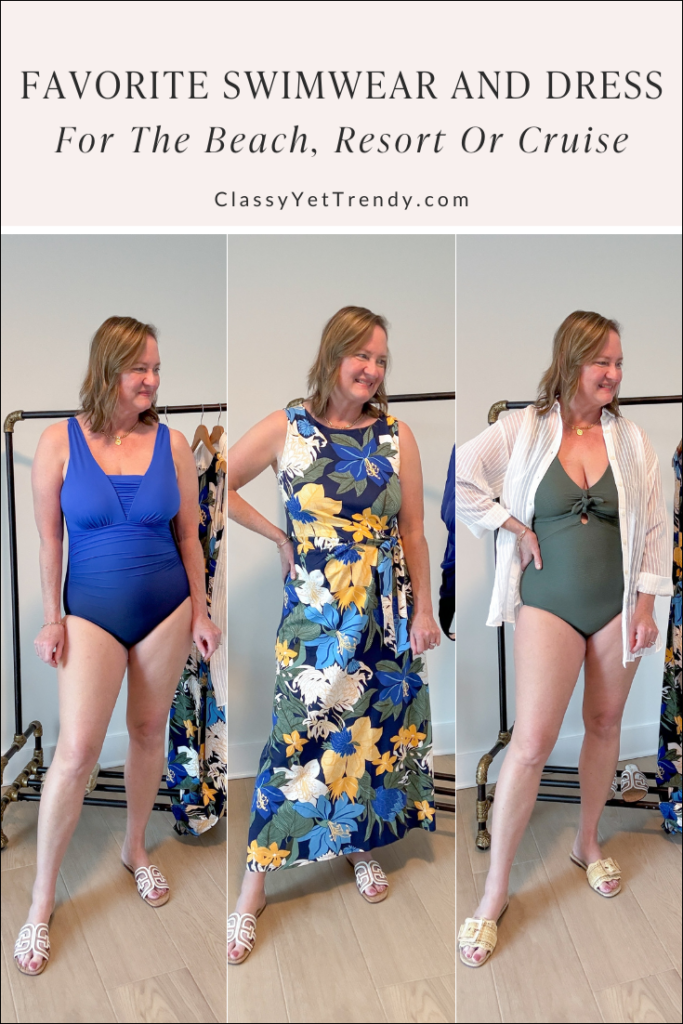 The swim suits are perfect. The dress is so pretty on you and very flattering. It’s such a nice fit. Love it all.