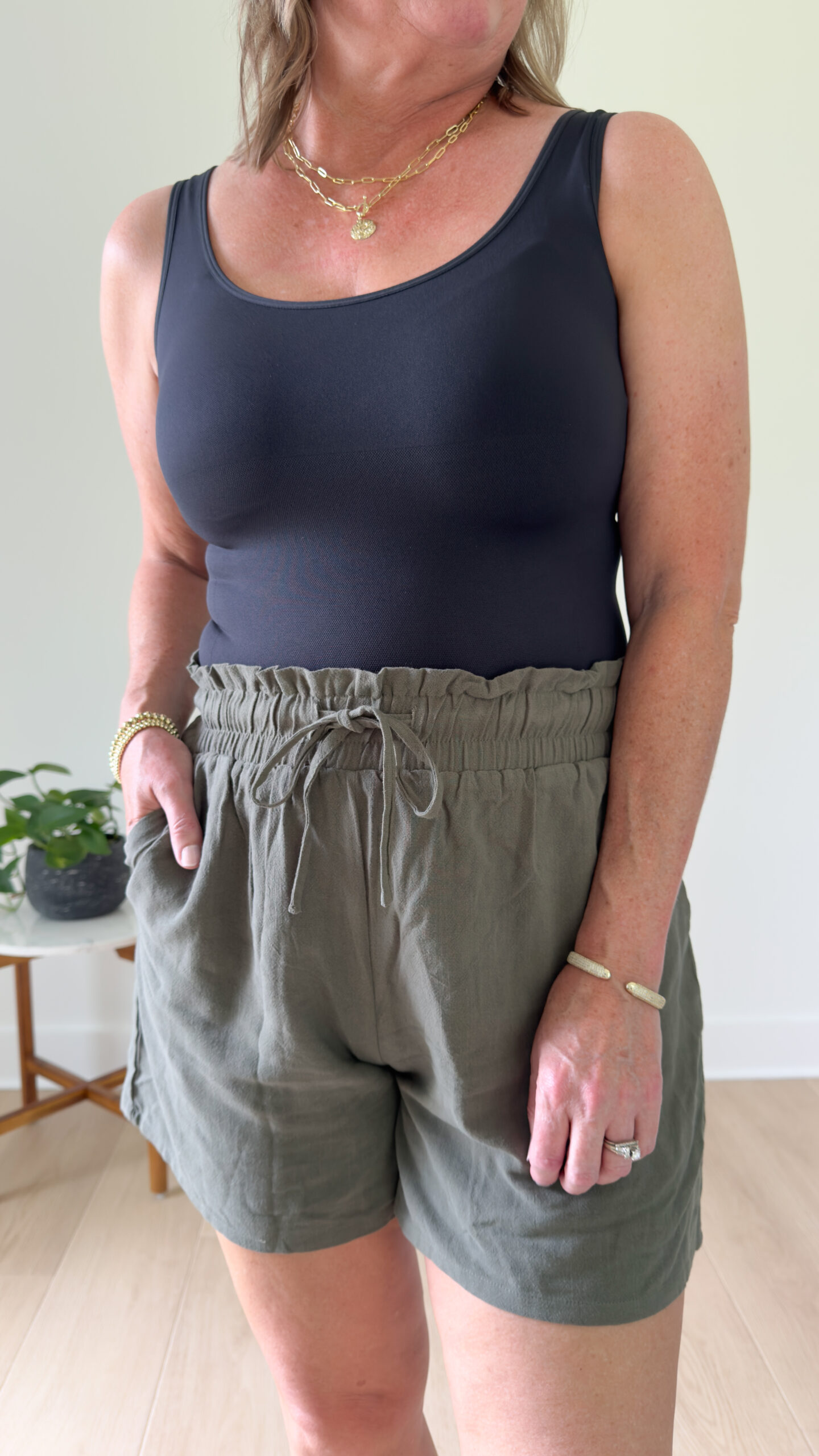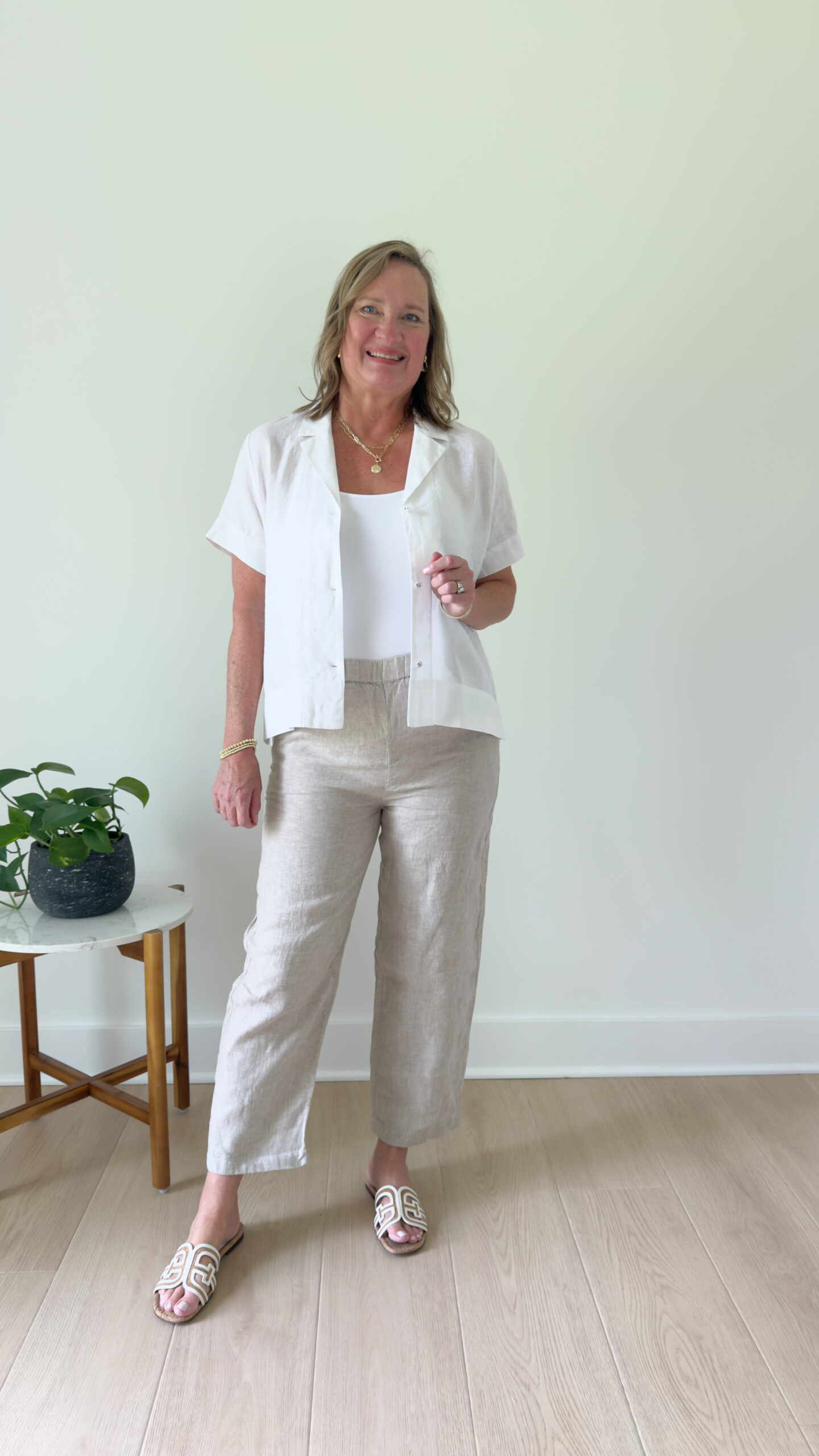 The Shapermint Essentials All Day Every Day Scoop Neck Cami in “white” (I’m wearing the size 10/12) fits like the Tank Cami above but with narrow straps. This scoop neck cami is perfect for layering or wearing it by itself with pants, skirts or shorts in the summer season! I styled it below with my linen pants and layered it underneath my linen shirt.