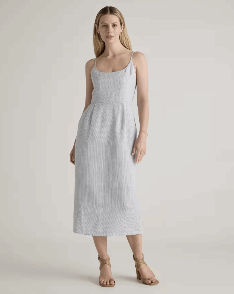 This dress is the European Linen Scoop Neck Midi Dress in the “Blue Pinstripe” color (size Large). You will LOVE this dress! It is is so elegant and pretty and I highly recommend it. It comes in several other colors and patterns as well. This Italian Leather Handwoven Convertible Clutch in the “Taupe” color is also from Quince. I’m wearing it as a shoulder bag in the 1st photo, but you can remove the strap and carry it as a clutch too (the 2nd photo)! The Block Heel Clear Strap Sandals in the “Nude/Tpu” color (fits true to size, size 9) is a must-have for your wardrobe! Trust me on these shoes as they will go with so many outfits!