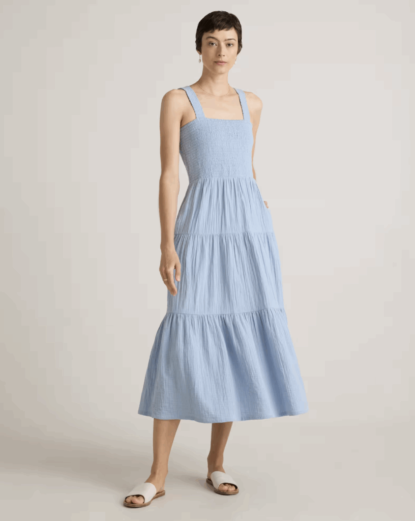 This next dress is the Organic Cotton Gauze Smocked Sleeveless Maxi Dress in “Ocean Breeze” in my usual size Large. The bodice his smocked for a flattering fit and the skirt is tiered. I absolutely love the color of this dress! Here is another summery bag I recently added to my wardrobe: the Straw Handwoven Top Handle Clutch Bag With Crossbody Strap from Amazon. It is the “beige” color. It’s a darling structured bag and holds all the essentials! Let’s talk about the sandals I’m wearing. They are the Clara Metal Toe Ring Sandals from Target in the “Cream” color (sized down half size to 8.5). I tried these on while I was at Target a few weeks ago and was pleasantly surprised how easy it was to walk in them. Since they were only $20 I bought them and they are quite comfortable! I’ve worn them many times and have received several compliments on them!
