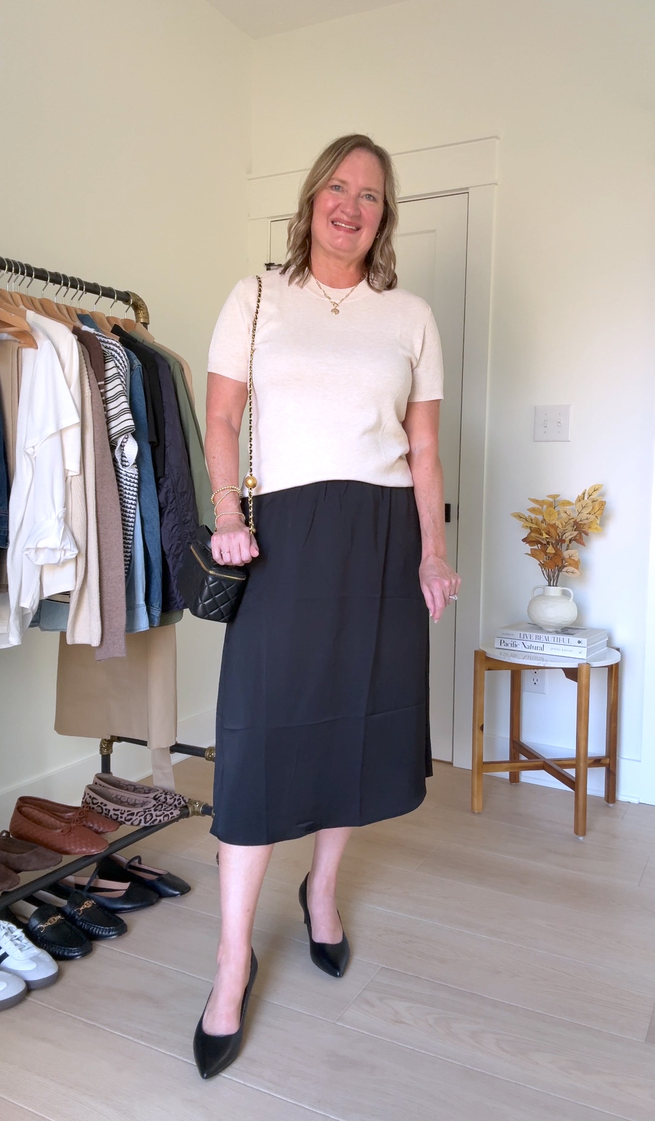 A black midi skirt is an essential in a wardrobe. You never know when you will need to wear a skirt and this one goes with nearly any top in my closet. This skirt is from Amazon (wearing a Large) and has an elastic waist with a drawstring. I tucked the drawstring in to make the skirt more dressy. My exact shoes are the Cole Haan Vandam Pumps (size 9), also love these block heel pumps HERE. I’m also wearing this darling little bag I bought from Amazon earlier this year. It is the Doris & Jacky Quilted Box Bag in the “black color. It looks like a Chanel bag and is real leather!
