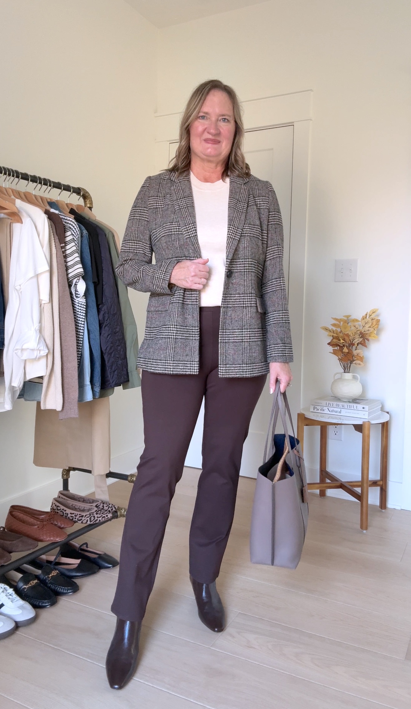 For all the career women, here is a workwear outfit for the Fall. This Amazon “The Drop” Edition Blazer (size Large) in the “plaid” color is so good! I added this blazer to my closet last year and have worn it a few times. It is very affordable and the fit is spot on. The blazer coordinates well with the Quince Ultra-Stretch Ponte Straight Leg Pants in “espresso” (I’m wearing the 28″ inseam for an ankle length fit, size Large). I’m also wearing these Madewell Dimes Boots in the “turkish coffee” color, which is a deep brown color. My exact boots are from last year with a zipper in the back, but this year’s version is an easy pull-on style. My tote is the Tory Burch Perry Tote in the “clam shell” color, which is so roomy and the neutral color looks great with any outfit. I use it to carry my Apple Laptop.