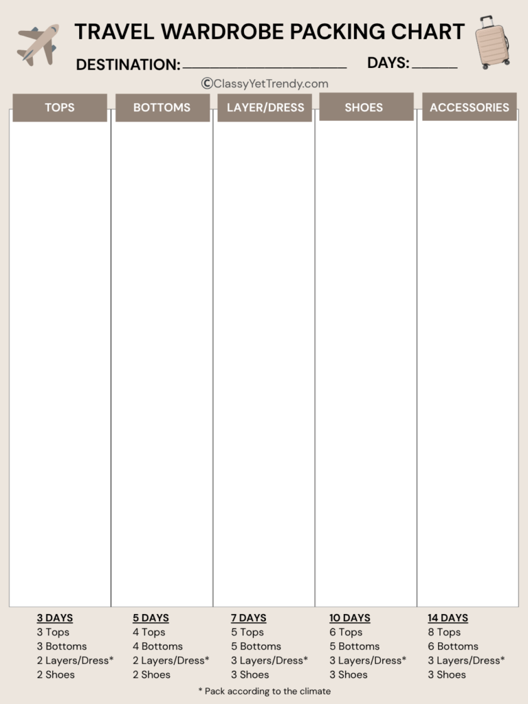 Use this chart to plan your travel wardrobe. See my post, “How To Build A Travel Capsule Wardrobe: 3 Steps To Have Lots Of Outfits In One Suitcase” to determine what pieces to pack, according to the number of days of your vacation/trip, the climate and your itinerary.