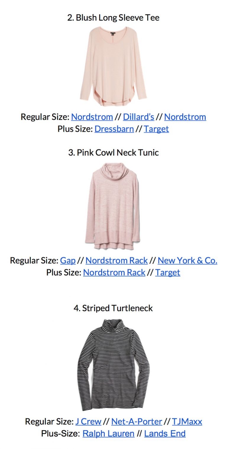 For each piece in the capsule, there are 3 regular-size and 2 plus-size shopping links each to offer you several choices. I refer only reliable retailers such as J. Crew Factory, J. Crew, Loft, Madewell, Nordstrom, Old Navy, Target, etc.
