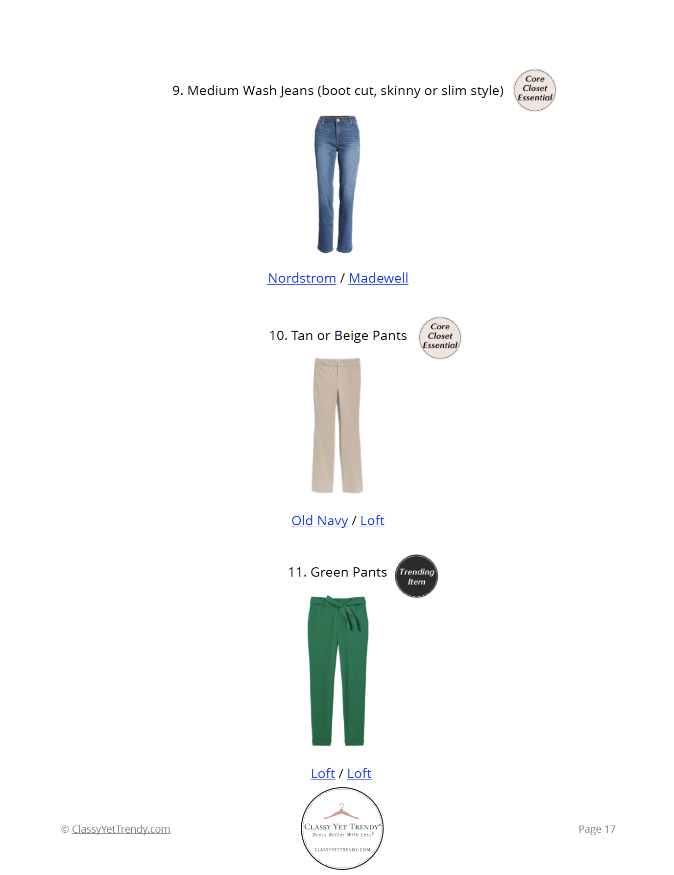 A complete wardrobe for the season! This capsule includes several foundation pieces plus a few trending colors for the season. You will receive a guide to creating the capsule wardrobe for your closet, visual guide with convenient regular-size shopping links for the clothes, shoes and accessories, checklist, travel packing guide (using 10 pieces and 7 outfits in the capsule), monthly outfit calendar, plus more!