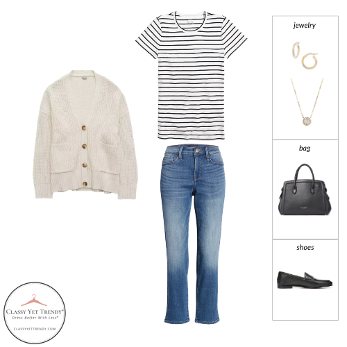 For each piece in the capsule, there are shopping links to offer you several choices. I refer only reliable retailers such as J. Crew Factory, J. Crew, Loft, Madewell, Nordstrom, Old Navy, Target, etc.