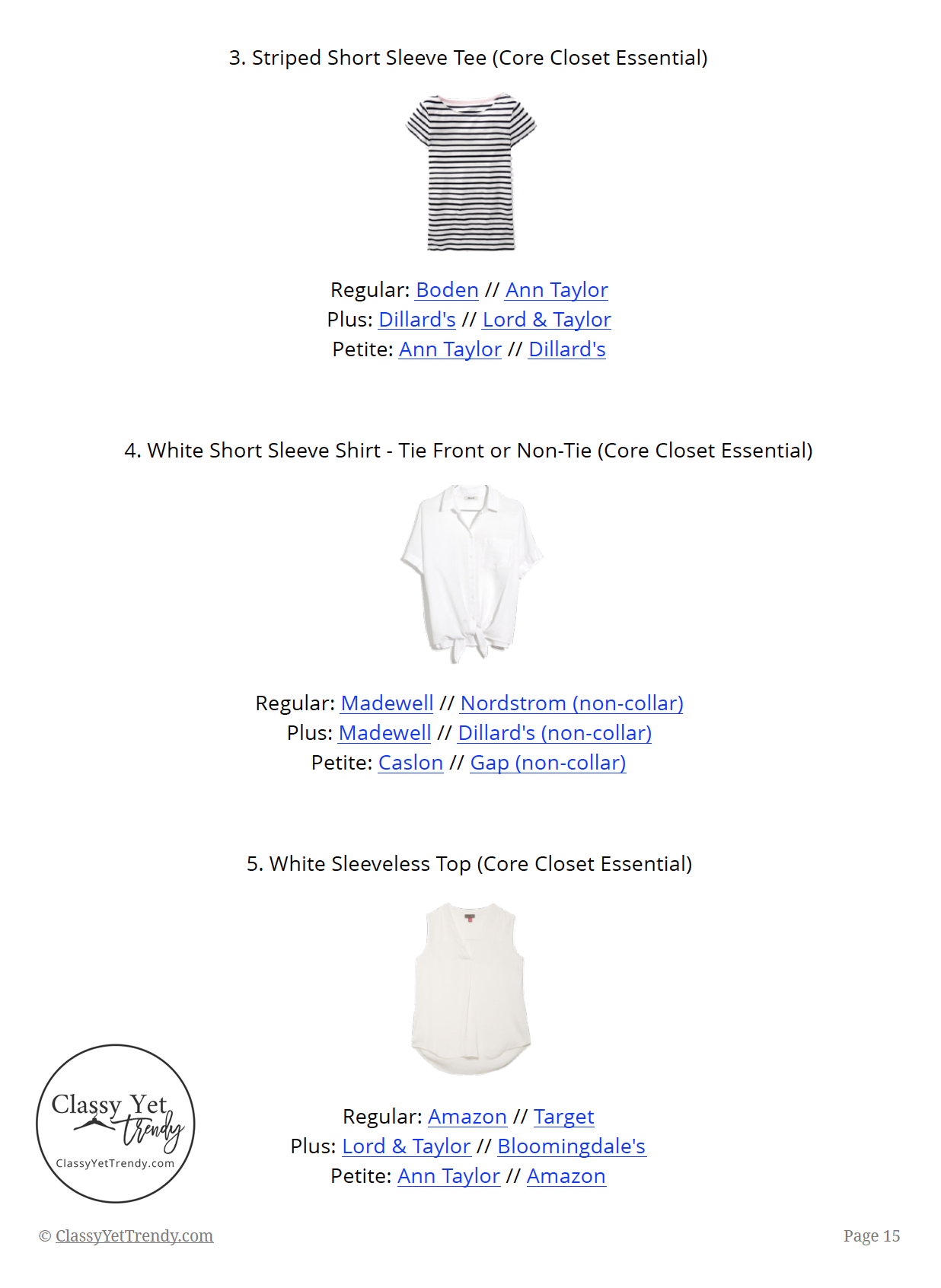 Each item in the eBook is a representation of the style to be used in the capsule wardrobe. Some or all the products in the shopping links will be similar to, but may not be exactly like the item shown, since each retailer’s product is slightly different. For example, if a piece shown in the eBook is a white tee, some or all the products in the shopping links underneath the white tee may not look exactly like the white tee shown, but all the shopping links contain the best selected styles for that particular piece. All pieces in the shopping links are carefully selected to ensure they will coordinate with other pieces in the capsule wardrobe.