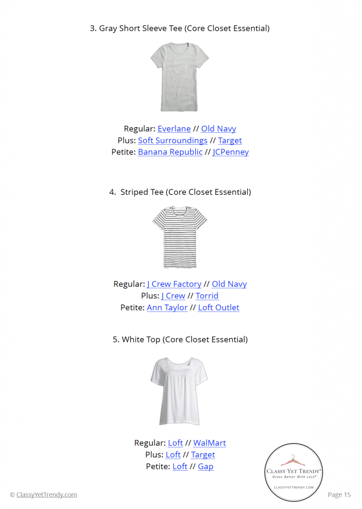 There are 2 regular, 2 plus and 2 petite size shopping links for each clothing piece in the capsule wardrobe. Regular and Petite sizes range on average from 0 to 14/16 and Plus-size range from 14 to 24. Please check the item’s sizes available on the retailer’s site. In the event that a piece may not be available in Petite sizes, “equivalent” styles in regular sizes will be linked.